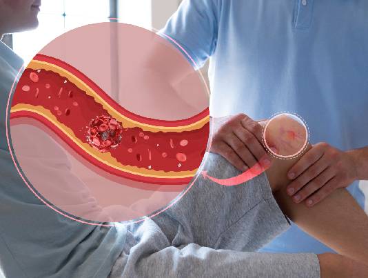 A circulatory condition in which narrowed blood vessels reduce blood flow to the limbs. Peripheral vascular disease is a sign of fatty deposits and calcium building up in the walls of the arteries (atherosclerosis). Risk factors include aging, diabetes and smoking. Symptoms may include leg pain, particularly when walking. Tobacco cessation, exercise and a healthy diet are often helpful. When these changes aren't enough, medication, stent or surgery can help.